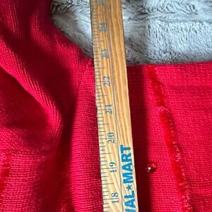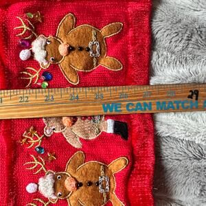The Quacker Factory was the darling of home shopping clubs since the 1990s. This brilliant Christmas red cardigan with happy reindeers along the front and back hemline. Faux gemstone stars and balls with gold lane horns abound. Pretty green tree bulb is the front sweater pull. 53% ramie and 35% cotton with 8% rayon and 4% Acrylic blend. Chennile stripe details. Beverly Goldberg would wear the heck out of this even though she celebrates the other December holiday.
