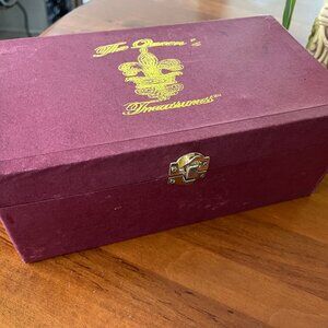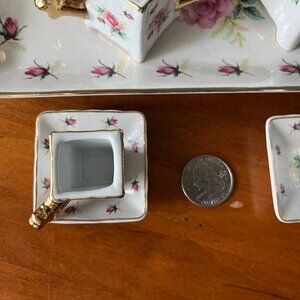The Queens Treasures miniature china tea set. Includes tea pot with lid, sugar bowl with lid, cream pitcher , two plates and cups. All in pristine condition with no chips or cracks. Comes in satin lined box. Some wear noted on box.