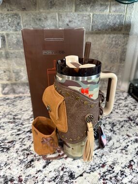 Stylish black tumbler with gold trim. Features a textured surface and sturdy handle. Includes a straw for convenience.