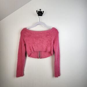 - Description: Pink cropped eyelash knit sweater; zip front closure; boat neck, or off-shoulder neckline design