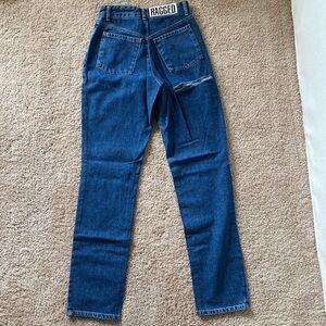 Give your booty the spotlight it deserves. Classic high waisted indigo mom jeans with rip detail. Complete with "RAGGED JEANS" back belt loop tab.