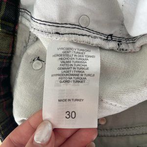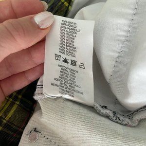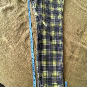 The Ragged Priest Check Print Mom Jeans in lime check size 30. These are the cutest pair of jeans but i just cant fit in them anymore. Size is marked 30 but would say it is on the smaller side... better for a true size 27-29 depending on how baggy you want them. Inseam is about 28.5 inches. This is the only pair of Ragged Priest jeans i have owned but day i got them the closure button popped off and I was too lazy to replace. The jeans are pretty rigid so i feel like the hardware just wasn't strong enough for the jean. Easy fix and Price has been adjusted for this... Please see additional photos for garment details.