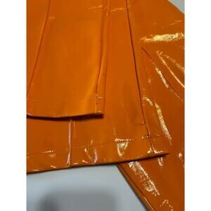 Good pre-owned condition, several small scuffs mostly at the pant hem, two on either knee area that are minimal. Bright orange faux patent leather. Mid rise, front zipper. Pleat seam front.