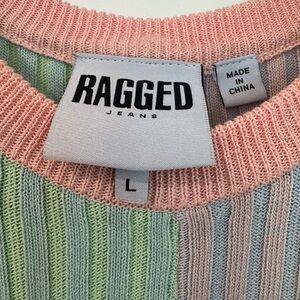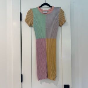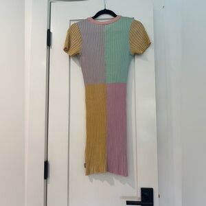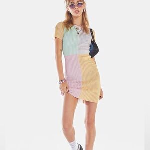 Short sleeve mini dress from The Ragged Priest. Colorful ribbed knit construction offers a bodycon fit topped with a crew neckline.