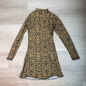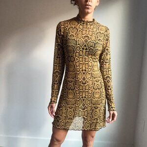 In excellent condition with no flaws! The Ragged Priest Slither Sheer Mini Dress is thin and sheer. You can wear dark undergarments underneath like a black bra and panty and it will be concealed well! Blends with the snakeskin print and bold yellow color. Features a mockneck and skater skirt detail.