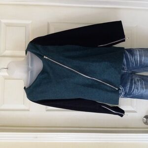 Stylish teal jacket with black sleeves. Features an asymmetrical zipper. Perfect for a bold look.SZ.M/L