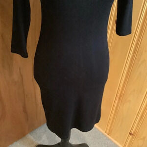 Cute black ribbed form fitting mini dress with 3/4 sleeves and asymmetric neckline. Neckline has button detail. Dress has stretch to it. In excellent like new condition. No stains or holes. Approximate measurements laying flat: bust 15” across from armpit to armpit, sleeve length 17” and length 32”.