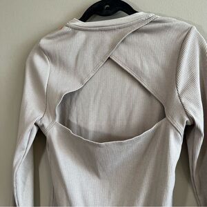 The Range NYC women’s cream Mass Rib Cross Back long sleeve bodysuit. Snaps at crotch. Cutout in back.