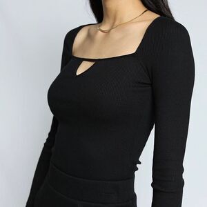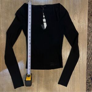 The Range Mass Rib Square Neck LS in Black. Size Medium. Fits True to Size - Ribbed Body Fits Tight and is Full Length. Square Neckline. Front Cut Out. Tuck in Length. Made in Canada. Hand Wash Cold Water, Do Not Bleach, Re-Shape and lay flat to dry, Low iron as needed. Dry cleanable. Wash darks separately