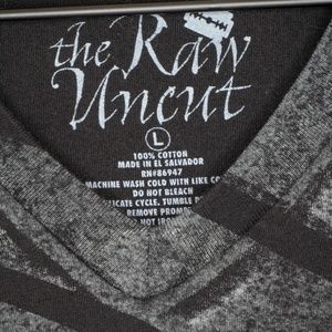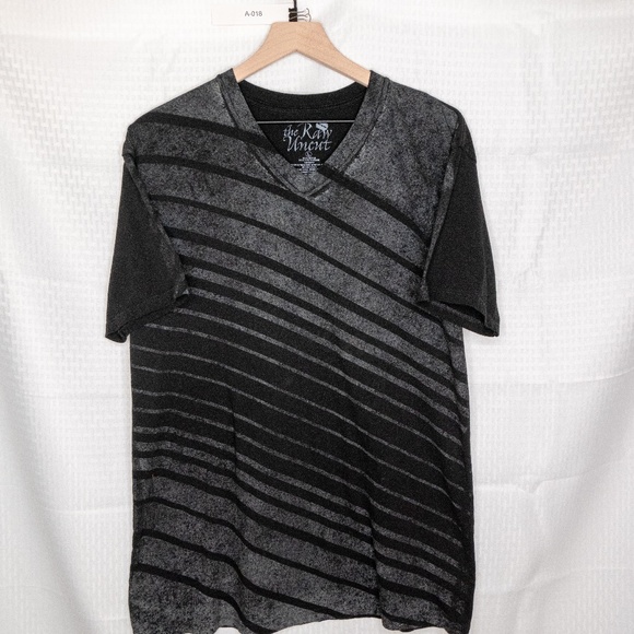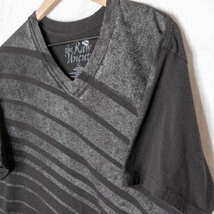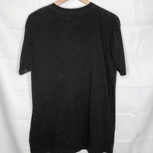 V-NECK SHORT SLEEVE SHIRT WITH ABRSTACT GRAY PRINT ON FRONT. SHIRT IS BLACK WITH PRINT ON FRONT AND SOLID BLACK ON BACK.
