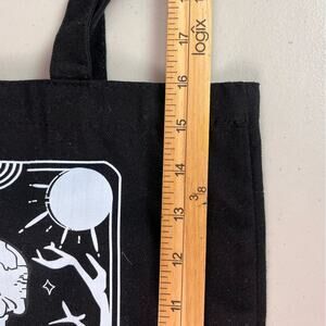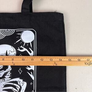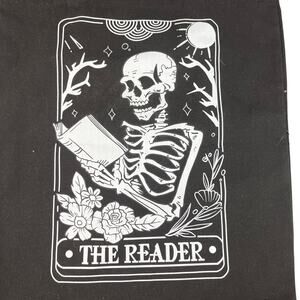 Fun graphic print tote bag, book bag with “The Reader” Skeleton on front. Black with white print.