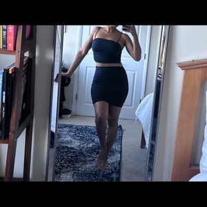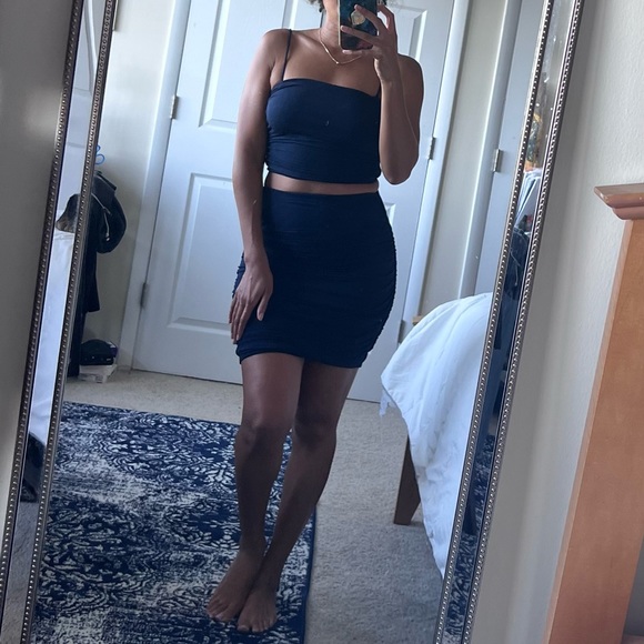 Brand New. Never Worn. Navy Blue Two Piece Set with ribbed sides. Comfortable and well made. Skirt does not ride up.