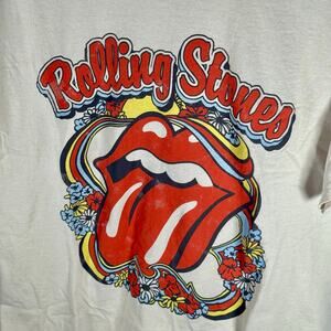 Amazing t-shirt featuring the logo of the band, the iconic Hot Lips, and flowers surrounding the lips. Made of 100% cotton in an off white color.