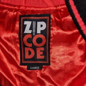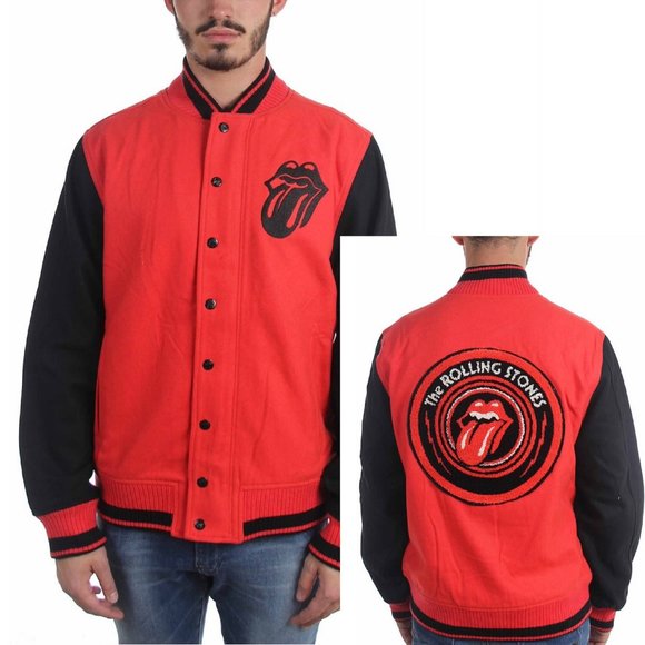 Rolling Stones limited edition red and black varsity jacket with snap button closure, elastic waist and wrist cuffs. Rolling Stones classic tongue logo on left breast, large circular embroidered version of the the tongue logo on the reverse. Quality materials and construction with screen printed design. Genuine officially licensed Rolling Stones product.