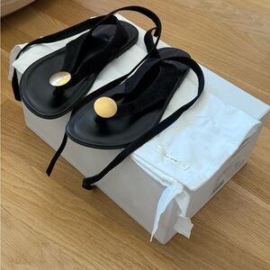 THE ROW ‘Charm Beach Sandal’ black lace up sandals with gold metal detail.