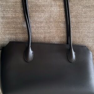 Sleek black leather shoulder bag. Minimalist design. Perfect for any occasion.
