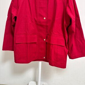 The Row's ‘Elodianna’ jacket in red is crafted from cotton and features an oversized fit. Its signature elements include a black contrast collar, a snap-button and zip closure, and a drawstring waist.