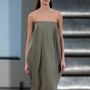 Sleeveless wool and silk-blend faille dress in green. Layered construction. Pleats at front. Concealed zip closure at back. Vented back hem. Inset corset featuring hook-eye fastening. Full gauze lining in off-white.