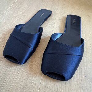 The Row Milla Flats in Navy. Luxury peep toe flat mules epitomizing minimalist elegance. Crafted in Italy, these sandals feature a satin upper and a sophisticated crossover design.