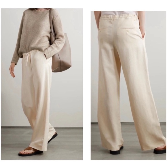 The Row ivory wide-leg drawstring pants in a lightweight silk linen blend with side slash pockets and back welt pockets.