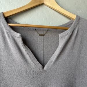 The Row Gray Knit V-Neck Long Sleeve Hi-Low Tunic Pullover Sweater. Split v round neck. Side hem slits. Neutral taupe/gray colored knit. Made in the USA. 100% cashmere. Care/size tag removed, measurements best reflect a size medium.
