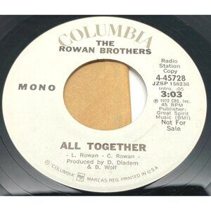 This 45 RPM vinyl record by The Rowan Brothers features "All Together" with both mono and stereo versions. It was released in 1972 by Columbia Records as a radio station copy.