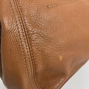 Great condition. Interior fabric is super clean. Back body, leather has one spot that's lighter, then to the left, one ink mark spot (refer to photo #4). Width: 10", Height: 9.5", Depth: 4", Handle drop: 9.5".