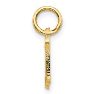Initial attraction in a textured fancy script design fashioned from satin finished 14k yellow gold. Each miniature upper case letter is approximately 10mm (3/8 Inch) in length and dangles from a classic jump ring that will fit up to a 2mm width chain. Made in the U.S.A. Chain not included. This item has an approx. length of 10mm and width of 10mm.
