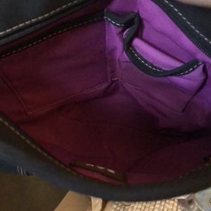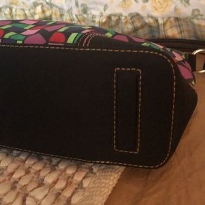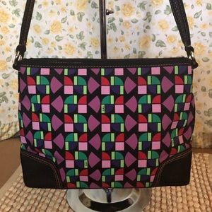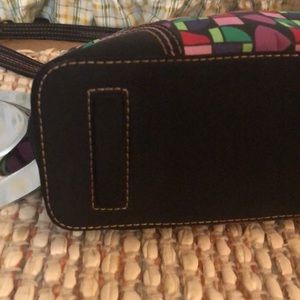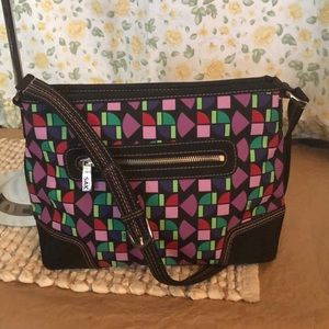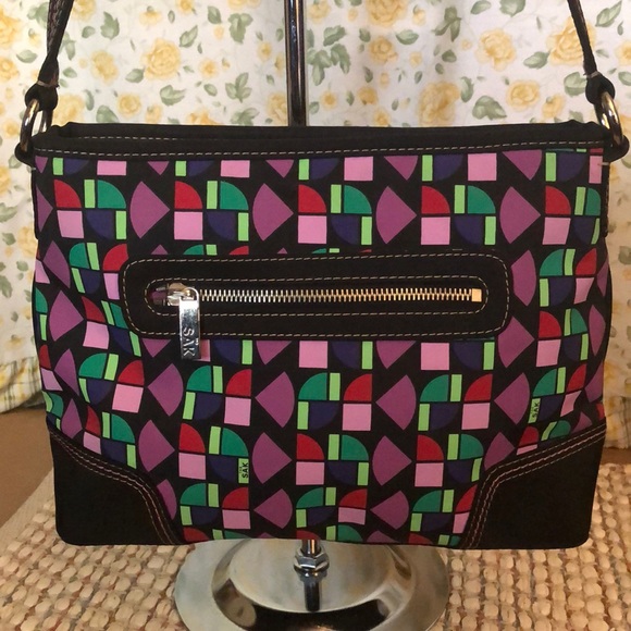The Sak. Multi colors. One zip pocket and two slip pockets and one pen slip. Front has one zip pocket. Adjustable strap. Easy clean material.