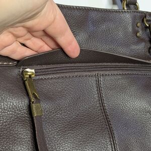 The Sak Alameda Dark Brown Leather Bag. Missing the crossbody strap, one small mark on the bottom and some stains on the lining (see photos)