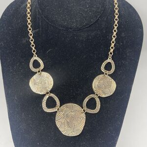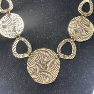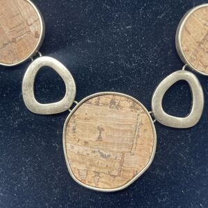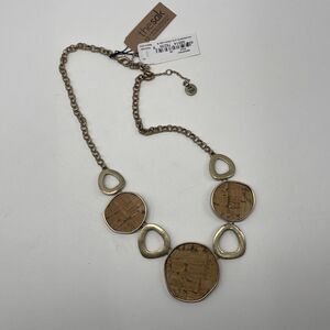 This great necklace could be worn both front and back for two different l ooks. Set in antique gold finish with one side having cork inlay and flip si de has a black line design. Measures 15 inches long with a 3 inch extender. Brand new with tags. Comes from a smoke free home.