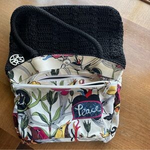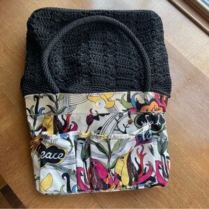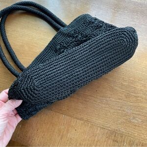 This elegant black crochet handbag is perfect for any occasion. Its intricate design and sturdy handles make it both stylish and functional. A must-have accessory for your wardrobe. So cute with the bag charm trend. Black woven exterior with colorful fabric lining. Great preowned condition. See photos for details.