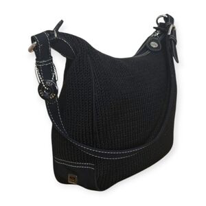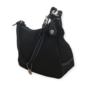 The Sak hobo bag in black crocheted signature tight weave. Features a zipper closure, silver hardware, and a two-sided hangtag. The interior is lined with a harlequin print and includes slip and zip pockets.