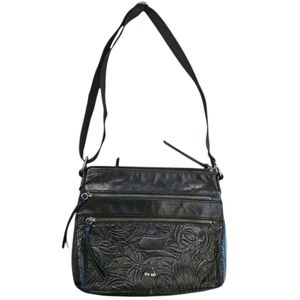 The Sak Black Reseda Multii Zip Embossed Leaf Detail Crossbody Purse 11" x 9"