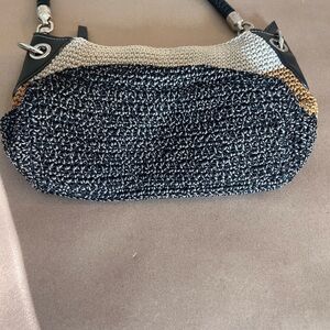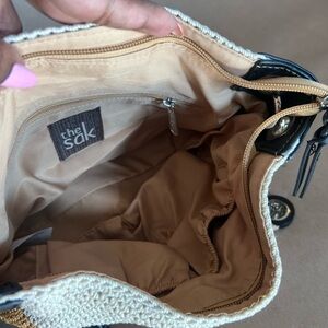 The Sak Black Tan Cream Vertical Stripes Crochet Small Shoulder Bag Zip Closure