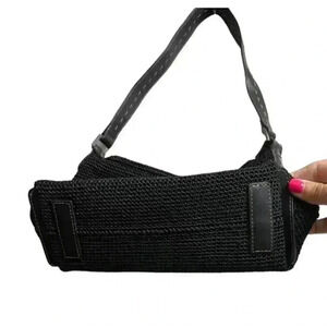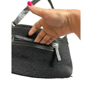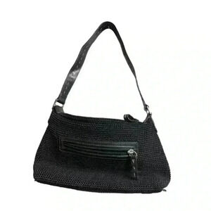Faux leather accents. Zipped pocket at the back of the bag. Toop zip with two open pockets and one zipped pocket on the black interior. One of the straps has came loose on one side and the thread is missing on the other.