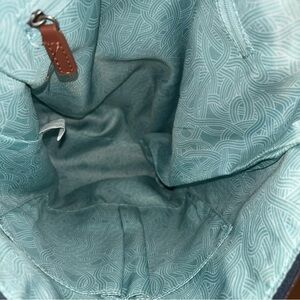 The Sak Blue Pebbled Leather and Canvas Whipstitch Flap Backpack