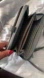 Stylish blue wristlet with gray accents. Features detachable strap. Ideal for versatile use.