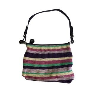 The Sak Boho Knitted Striped Multicolor Shoulder Bag. Pink inside Two logo charms Leather strap Big magnetic closure pocket in the front Zipper closure Zipper and two slip pockets inside Overall good condition due to stains on inside of bag please see photos. Outside in really good condition