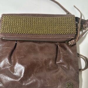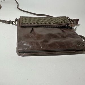 The Sak's brown crossbody bag combines elegance and functionality with its soft, leather-like material and shimmering metallic panel. The long strap allows for versatile wear, while decorative tassels add a stylish touch to this chic accessory.
