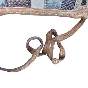 Crafted with a blend of style and functionality, The Sak Brown Silver Studded Shoulder Purse offers a chic accessory for any woman on the go. The patchwork design exudes a Boho vibe, while the small size ensures it's compact enough for your daily essentials. Distressed leather exterior and an animal print pattern make it a standout piece, perfect for casual outings or travel. The bag boasts a roomy interior with inner pockets to keep your items organized. The multicolor lining adds a pop of color to the overall aesthetic. A comfortable leather shoulder strap and a matching handle in brown ensure easy carrying, making it a practical choice for those who value both fashion and convenience.