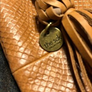 Chic brown crossbody bag with textured design. Includes braided detail and tassel accent.