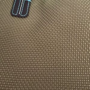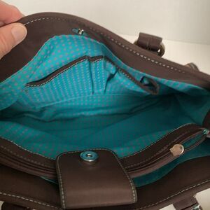 This bag features a tan mesh exterior and a fun blue polka dot lining. Top magnetic snap closure. Inside pockets. Dual Handle. Silver Hardware & zipper pulls.