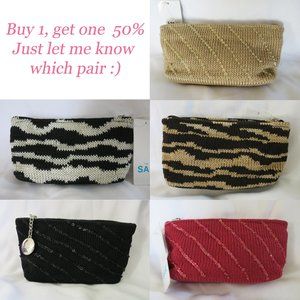 NWT!! This crochet cosmetic pouch has black and white stripes, and closes with a zipper. With its flat, firm base, it can stand on its own. I like these bags especially for my lipsticks/glosses/liners and my mascaras & eyeliners. Great for organizing my always-growing stash. They're also a perfect & secure way to carry your feminine products ;)