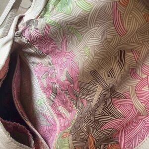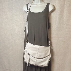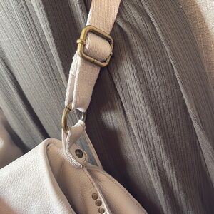 Stylish cream crossbody bag. Features adjustable strap. Perfect for everyday use.