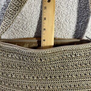 The Sak brand crochet crossbody bag in a Tan color with a slight shimmer