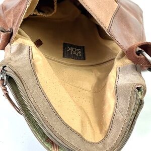 The Sak Deena flap crossbody patchwork brown leather with taupe suede and.light brown leather. One patch that is mostly covered by the flap has very subtle tiny gold sparkles. Large back zip compartment forms the flap over a second large compartment. Small inside side zip pocket and small side interior pocket. Long crossbody strap.