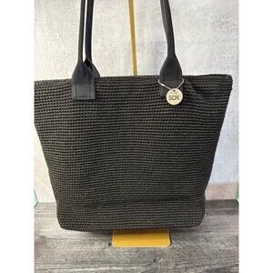 The Sak Elliott Lucca Crochet Bag is a black, woven handbag with double handles and a zipper closure. It features leather accents and a metal charm with the brand logo. The bag's interior is lined with a nylon fabric and includes an inner zipper pocket. The Sak bags, including this one, are often handmade and made from materials like polypropylene, leather, and recycled plastics.