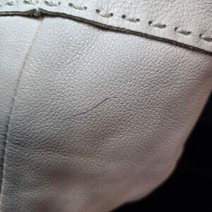 Great pre-loved condition on the outside with the exception of an ink mark and a peel on the bottom (see last 2 photos). Inside could use a good cleaning. Color is Ivory with Brown leather straps/detail.