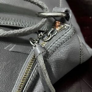 This is a gray leather crossbody bag from The Sak. It is in excellent pre-owned condition with minimal signs of wear (SEE PHOTOS AND READ DESCRIPTION).